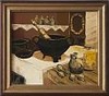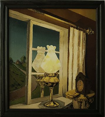 Oczekiwanie obraz olejny, 60cm x 52cm Zegar już zatarł mechanizm od czekania - chyba daremny czas i nadzieja. Tylko lampa w oknie z oddali drogi potwierdza, że wciąż czeka nadzieją dolewana oliwa, by nie zgasła i lampa i ona...