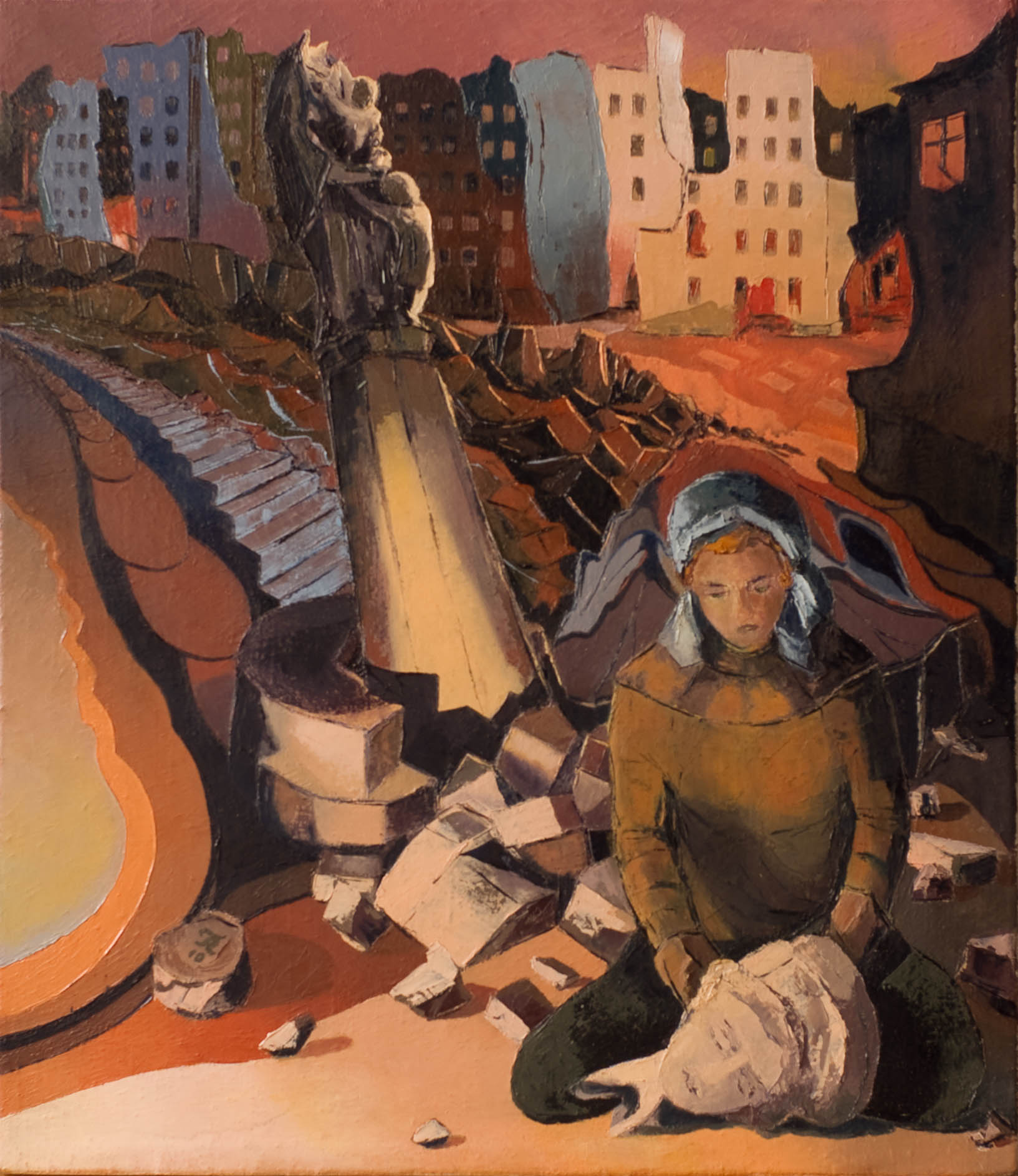Obłęd nienawiści... obraz olejny, 52cm x 60cm Nienawiść zniszczy wszystko. Nawet pomnik macierzyństwa, mimo, że kamienny, ma zbyt wiele przesłania i ciepła. To też dlatego dla niej jest nieobojętny...