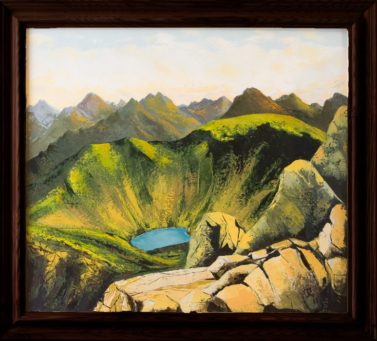 Zachwycający widok z Orlej Perci obraz olejny, 62cm x 52cm Zachwyciłem się widokiem Tatr Wysokich idąc graniami Orlej Perci."Naszkicowałem"aparatem,namalowałem szpachlą.